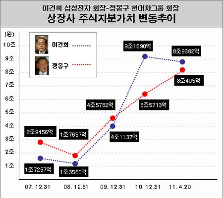 이건희 회장은 지난해 5월 삼성생명 상장 이후 한때 주식평가액이 9조원을 넘기도 했지만, 보유지분이 많은 삼성전자 등 일부 계열사 주가가 부진을 보이면서 지분가치가 소폭 감소했다. 반면 정몽구 회장은 이 날 8조405억 원을 기록, 처음으로 보유주식 가치가 8조 원 대 돌파했다. 정 회장의 지분가치는 올해 들어 크게 증가한 것이다.