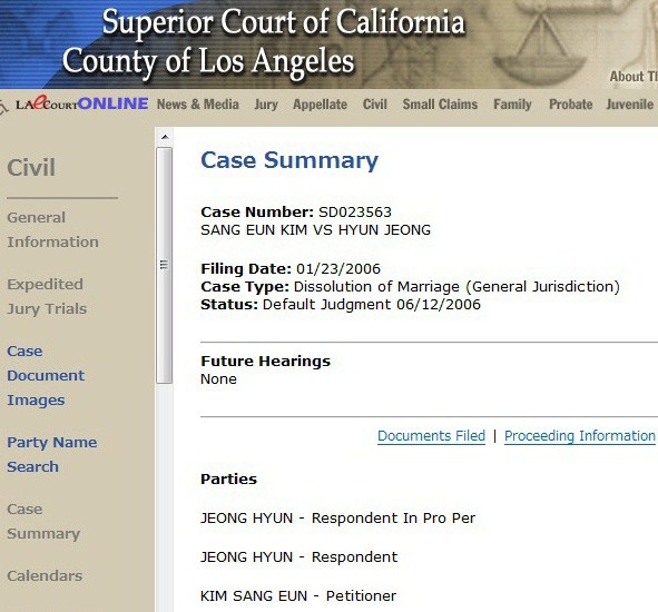 실제로 해당 사이트에서 'Case Summary(케이스 써머리)'를 클릭한 뒤 'Case Number(케이스 넘버 : 사건 번호)'에 'SD023563'을 입력하면 2006년 1월 23일 원고 'KIM SANG EUN(김상은)'이 피고 'JEONG HYUN(정현)'을 상대로 제기한 이혼 소송 결과를 볼 수 있다.