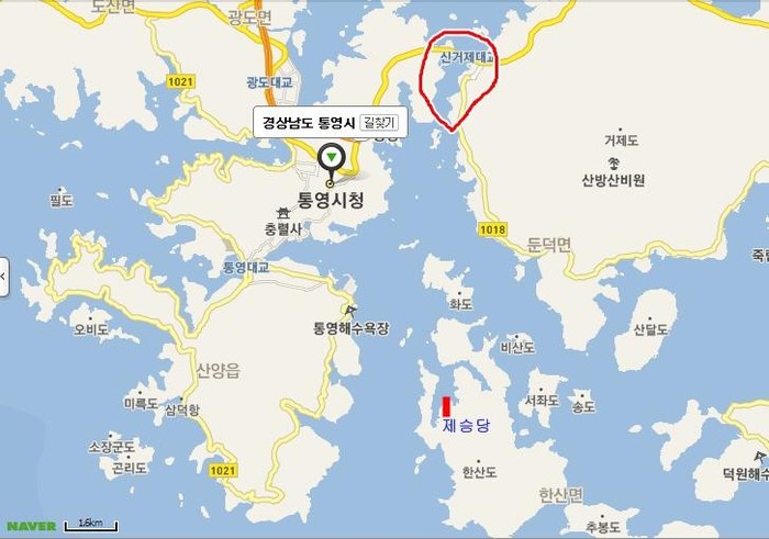 • 지도에서 보듯 한산도 위쪽으로 신거제대교가 보인다.