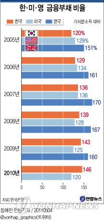 우리나라 가계의 가처분소득 대비 금융부채 비율은 2005년 120%, 2006년 129%, 2007년 136%, 2008년 139%, 2009년 143%, 2010년 146%로 지속적으로 상승세를 보였다.