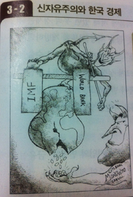 ▲신자유주의 비판 삽화를 실은 미래엔컬처그룹 발간 한국사 교과서(p.377)교과서의 反기업 정서는 특히 천재교육과 미래엔컬처그룹 발간 교과서에서 두드러졌다. 천재교육 발간 교과서는 한국 경제의 비약적인 발전상을 소개하면서 그 원인을 우수한 노동자와 유학생, 전문 공무원들에게 돌리고 있을 뿐, 기업에 대한 언급은 하지 않거나 간략하고 소극적으로 표현하고 있다.
