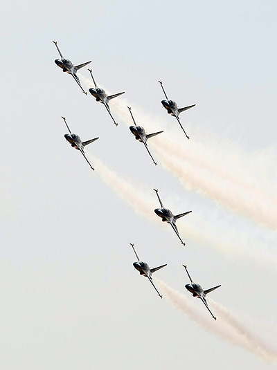 이어서 저 멀리 창공에 “쉬익~” 굉음을 내며 8대의 T-50 비행기가 모습을 드러낸다. 공군 특수비행팀 ‘블랙이글스’다. 8대의 비행기가 하얀 연막탄으로 태극 모양, 하트 모양을 만들며 곡예를 펼치자 관람객들은 “우와~” 탄성을 지른다. 박수가 이어졌다.