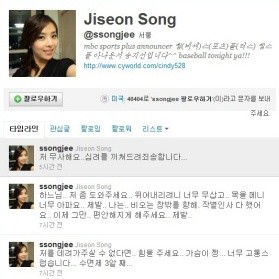 7일 새벽 자살을 암시하는 글을 트위터에 올려 파장을 일으킨 송지선 MBC 스포츠 플러스 아나운서가 비슷한 시간에 미니홈피 다이어리를 통해 한 야구선수와 얽힌 충격적인 스토리를 풀어낸 것으로 알려져 주목된다.