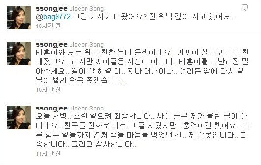 이어 "태훈이와 저는 워낙 친한 누나 동생"이라며 "싸이글은 사실이 아니니. 태훈이를 비난하진 말아달라"고 당부했다.