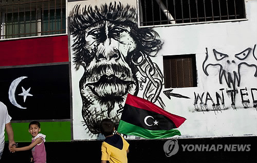 리비아 동부도시 벵가지의 어린이들이 31일(현지 시각) 무아마르 카다피 국가원수의 얼굴이 험상궂게 그려진 벽화 앞을 지나고 있다. (AP=연합뉴스)