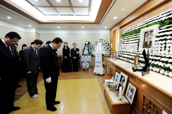 이 대통령은 이날 고려대 안암병원에 마련된 빈소에 도착한 뒤 김정배 고려중앙학원이사장의 안내로 고인의 영전에 헌화, 분양했다.