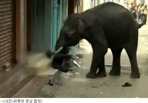 이 도시 뱀부 바자르 지역 건물 밖에 있던 은행 경비원 레누카 프라사드(55)는 갑자기 달려든 수컷 코끼리를 피해 피신할 곳을 찾다가 코끼리에게 붙들려 화를 당했다.