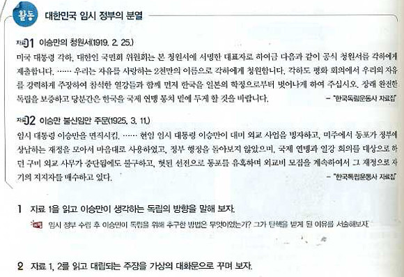 삼화출판사刊 교과서에는 탐구활동에서 “만주와 연해주의 독립운동가 가운데는 이승만의 ( ) 위임 통치 사건을 계기로 임시 정부의 ( )노선을 비판하고 해체를 요구하는 사람들도 있었다”(p.237)라는 괄호안 넣기 문제가 등장한다.