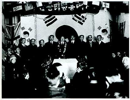 <1920년 12월28일 상해 임시정부 청사에서 열린 대한민국 임시정부 초대 대통령 이승만의 취임식. 이승만은 일본의 감시를 피해 하와이에서 네덜란드 선적의 화물선에 실린 관 속에 숨어 상해로 왔다. 당시 이승만은 일본 당국에 의해 30만 달러의 현상금이 걸려있었다. (사진 왼쪽부터 손정도, 이동녕, 이시영, 이동휘, 이승만, 안창호) 출처: 이승만과 그의 시대>