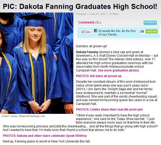 사진 속에서 다코타 패닝은 파란 학사모와 가운을 걸치고 졸업식에 참석한 모습을 보였는데 기존의 귀여운 모습 대신 성숙한 여인의 분위기를 풍겨 눈길을 끌고 있다.