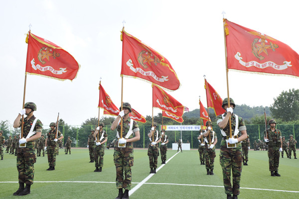 - ▲ 15일 해병대사령부에서 서북도서방위사령부 창설식이 거행됐다. 김관진 국방장관이 부대기를 전달하고 있다.
