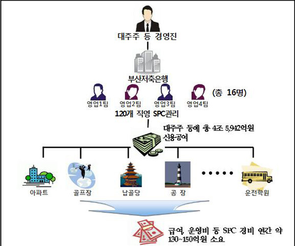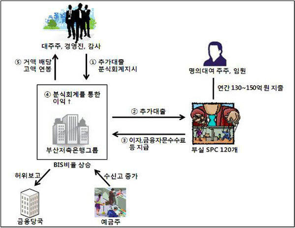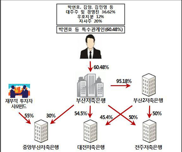 지난 5월 2일 검찰이 부산저축은행 관련자들을 기소하면서 작성한 설명 자료에 따르면 부산저축은행은 계열사 간 순환출자를 통해 대주주와 경영진이 5개 산하 저축은행을 좌우했던 것으로 드러났다.