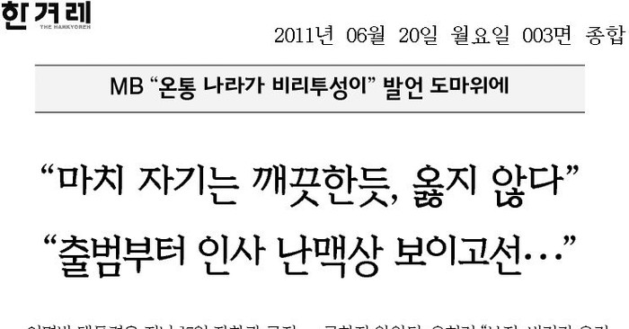 이 기사를 통해 한겨레는 지난 17일 국정토론회에서 있었던 “온통 나라 전체가 비리투성이 같다”고 말한 이 대통령의 격정 토론을 소개했다.