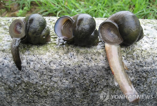 경기도 파주 문산에서 마치 토종 우렁이가 미꾸라지를 잡아먹는 듯한 모습이 카메라에 포착됐다. 사진은 지난해 6월 주민 김인봉(60)씨가 찍은 것으로, 김씨는 모내기를 마친 뒤 내포리 논에서 잡은 토종 우렁이와 미꾸라지를 함께 담아놨는데 죽은 미꾸라지가 빨판으로 빨려 들어가 마치 잡아먹는 것 같은 모습을 하고 있다. 그러나 우렁이는 잡식성이기는 하지만 식물이나 유기물을 먹고 살며 살아있는 미꾸라지를 잡아먹는 것은 불가능하다. 미꾸라지가 개펄 속으로 파고드는 속성을 발휘, 우렁이 집 속으로 파고 들어간 것이다. <사진 김인봉씨 제공>
