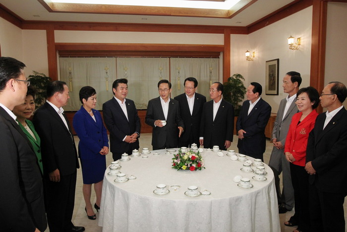 민주당 의원들은 오는 27일 이 대통령과 민주당 손학규 대표와의 조찬 회동에 앞서 이 대통령을 만나는 것은 적절치 않다며 참석하지 않았다.