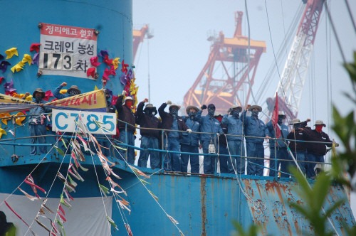 한진중공업 영도조선소 타워크레인에 무단 침입, 174일째 농성을 하고 있다. 인터넷 트위터를 통해 실시간 시위현장을 중계하면서 선동을 부추기고 있다. 6월27일 노사간 파업타결 후, 장향숙 인권위 상임위원에게 전화를 걸어 "전기가 끊기고 용역업체 직원들이 휴대전화 배터리나 죽도 올려 보내지 못하도록 하고 있다. 용변을 본 양동이도 옮기지 못하는 상황"이라며 "사측에서 어젯밤부터 전기 공급을 중단했다"고 말하며 감성에 호소하고 있다. 농성 185일째가 되는 날, 전국 각지에서 185대의 희방버스에 탑승할 것을 종용하며 소영웅 심리에 희희낙낙하던 모습을 감추고, 다시 약자의 모습을 보이고 있는 것이다.