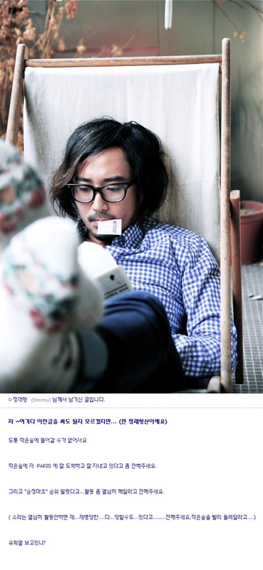 이어 그는 "작은숲(정재형의 공식 홈페이지)에 저 PARIS에 잘 도착하고 잘 지내고 있다고 좀 전해주세요. '순정마초' 순위 밀렸다고 활동 좀 열심히 해달라고 전해주세요. 유희열 보고있나"라는 재치있는 문구를 올렸다.