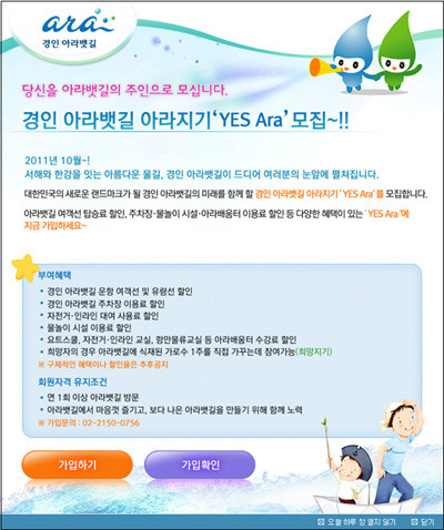 ‘YES Ara’ 가입을 원하는 국민은 누구나 12일부터 경인아라뱃길 홈페이지(www.giwaterway.com)를 통해 가입할 수 있다.