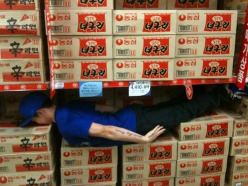 공개된 사진 속 재범은 마트로 보이는 곳에서 라면 박스들이 수북하게 쌓인 틈을 비집고 납작하게 드러누워 있는 모습으로 다소 엽기적인 포즈를 취하고 있다.