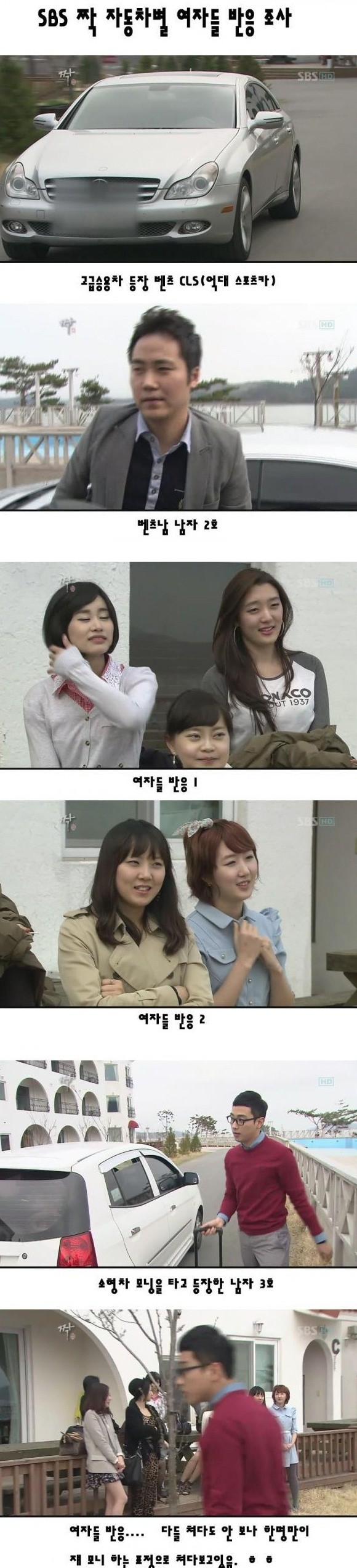 해당 사진을 살펴보면 '벤츠 CLS'를 타고 촬영장에 나타난 남성에게는 여성 출연진들이 높은 관심으로 보였고, 국산차 '모닝'을 타고 나타난 남성은 여성들의 외면을 받았다는 사진 캡션이 달려 있다.
