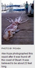 28일 미국 UPI통신 등 외신은 “촉수 길이까지 7.5m에 가까운 대왕오징어가 지난 27일 플로리다 대서양 연안의 바다 한가운데서 죽은 채 발견됐다”고 보도했다.