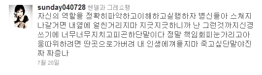 선데이는 지난 20일 자신의 트위터에 “자신의 역할을 정확히 파악하고 이해하고 실행하자. 병신들아. 스쳐 지나갈거면 내 옆에 얼씬거리지마. 지긋지긋하니까. 난 그런 것까지 신경 쓰기에 너무 너무 지치고 피곤하단 말이다”라는 글을 남겼다.