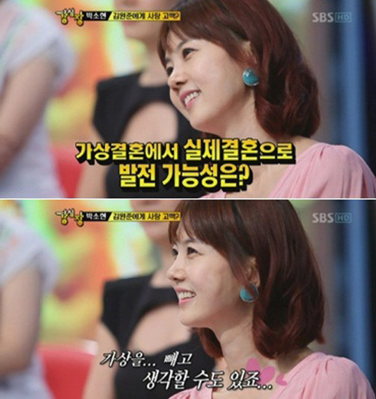 박소현은 지난 26일 방송된 SBS 예능프로그램 ‘강심장’에 출연하여 ‘우리 결혼했어요’에서 가상 부부로 출연하고 있는 가수 김원준에 대한 솔직한 생각을 털어놨다.