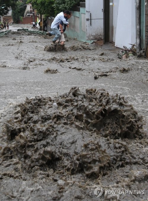 ▶중부지방 기습폭우로 산사태 등 피해를 입은 서울 서초구 우면동 형촌마을에서 28일 맨홀의 하수가 역류해 물이 치솟는 가운데 주민들이 물길을 건너고 있다.