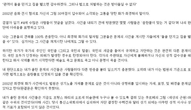 그는 "내가 올린 문제의 사진들은 지금도 오르세 미술관에 누구나 볼 수 있도록 걸려 있는 쿠르베의 그림과 같은 수위의 것이었다"며 여성의 음부가 적나라하게 그려진 <세상의 근원> 그림을 블로그에 게재했다.