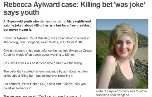 이날 보도에 따르면 조수아 데이비스(16)라는 이 소년은 친구들에게 “레베카를 죽여버리겠다”는 말을 입버릇처럼 했다고 한다. 이 때마다 그의 친구들은 “네 말대로 레베카를 진짜 죽인다면 내가 밥 한 번 살게”라며 장난치 듯 내기를 제안했던 것으로 알려졌다.