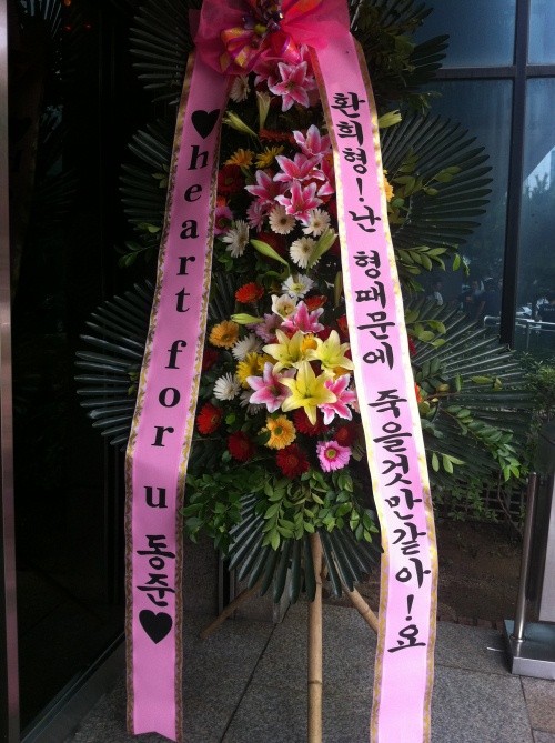 동준은 29일 뮤직뱅크를 통해 컴백한 환희를 위해 “환희 형! 난 형 때문에 죽을 것만 같아!요” “♡ Heart for U 동준 ♡” 이라는 화환문구를 선보이는 센스를 발휘 했다. 이는 환희의 타이틀곡 ‘죽을 것만 같아’와 제국의 아이들의 더블타이틀곡 “Heart for 2”의 제목을 인용한 것이다.