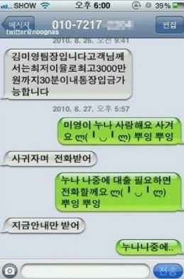 김씨는 12명의 직원을 고용, 휴대전화 문자로 불특정 다수에게 "김미영 팀장입니다. 고객님께서는 최저이율로 최고 3000만원까지 30분 이내 통장입금 가능합니다.", "'신'한 ㅋ ㅐ 피탈☞고객님은 보증/최저이^율로 100~3,000만 금일송^금 가능☎상담전화" 등의 내용을 전송하는가하면 최근엔 스마트폰 카카오톡과 트위터로까지 광고 영역을 확대했던 것으로 드러났다.
