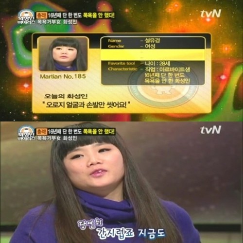 이날 방송에서 이 여성은 목욕을 하지 않는 이유에 대해 “우선 귀찮다. 또 돈 들여 목욕탕을 가는 게 이해가 되지 않는다”고 밝혀 네티즌들을 충격의 도가니로 몰아넣었다. 여기에다 이 여성과 결혼을 약속한 남자가 있다는 사실이 전해져 네티즌들은 또다시 큰 쇼크에 빠졌다.