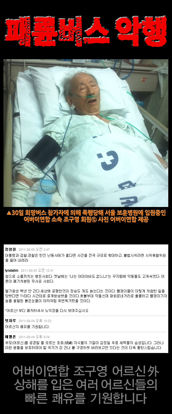 이명박 정부와 한나라당과 자유선진당이 최소한의 애국심과 준법정신을 가진 정치집단이라면, 희망버스라는 좌익깽판극의 소품을 제거해야 한다. 종북좌익세력이 이렇게 번성하여 대한민국의 주말밤을 반란의 깽판으로 얼룩지게 방치하는 것은 망국을 방관하는 것과 같다. 더운 여름날에 경찰들이 두꺼운 방어복을 입고 좌익깽판꾼들에 맨주먹으로 대치하게 만드는 것 자체가 인권유린이고 국민학대이다. 희망버스니 희망시국대회의 이름으로 제2의 광우난동사태를 만들려는 종북좌익세력을 진압할 의지와 능력이 없으면, 정부와 여당은 권력을 내놓기 바란다. 야간에 폭란을 기도하는 종북좌익세력의 반란적 깽판을 제압하지 못하는 정권은 무자격 통치집단으로 낙인될 수 있다. 희망버스 깽판극의 주범들은 엄벌해야 한다.