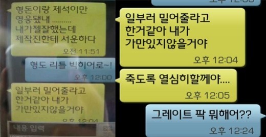 지난 6일 논란이 된 질투 문자의 내용은 “형돈이랑 재석이만 영웅됐네” “내가 제일 잘했는데” “제작진에게 서운하다” “일부러 밀어주려고 한 것 같아” “내가 가만있지 않을 거야”는 등이다.
