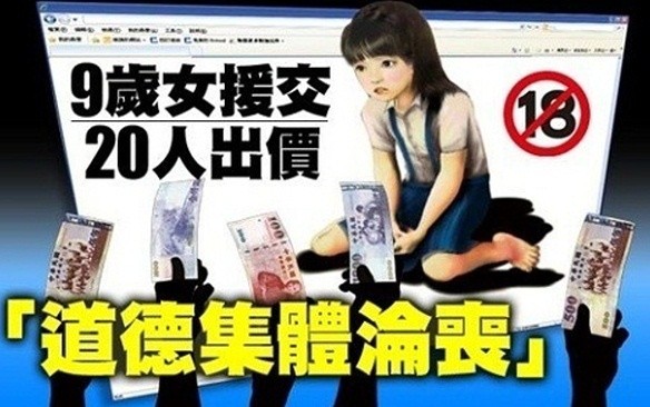 홍콩 빈과일보에 따르면 대만 타이베이시 문산구에 사는 한 초등학교 3학년 소녀가 지난 11일 한 성인사이트에 "올해 9살, 원조교제 모집"이라는 광고 문구를 올린 것으로 밝혀졌다.