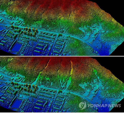 국토해양부 국토지리연구원은 중부지역을 강타한 폭우로 산사태 피해가 발생한 지역의 항공사진을 16일 공개했다. 사진은 서울 우면산을 항공레이더로 촬영한 것으로 위 사진은 2009년 8월, 아래는 산사태 이후인 2011년 8월 모습.