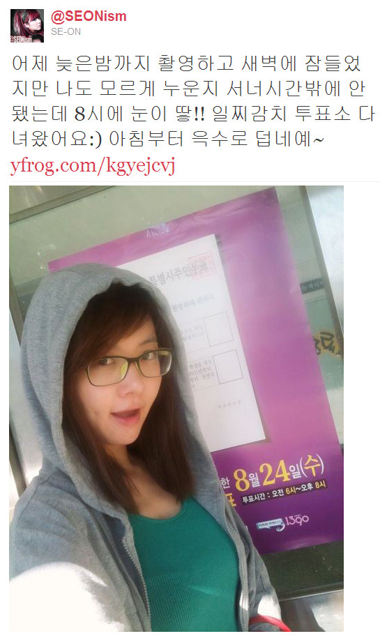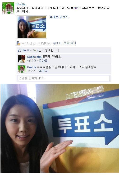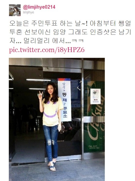 현재 인제오토피아 킥스레이싱팀 소속으로 활동 중인 임지혜는 "오늘은 주민투표 하는 날~! 아침부터 쌩얼 투혼 선보이신 임양 그래도 인증샷은 남기자..멀리멀리에서.."라는 글과 함께 투표장 앞에서 찍은 인증샷을 트위터에 게재했다.