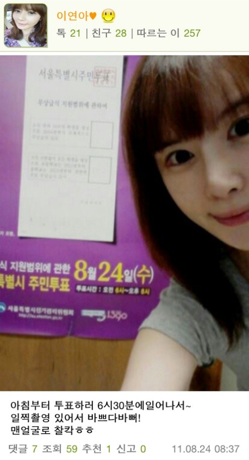 24일 서울 시내 학교의 무상급식 지원 범위를 결정하는 주민투표가 실시되고 있는 가운데, '눈부신' 미녀들이 시내 각 투표장에 등장해 눈길을 끌었다.