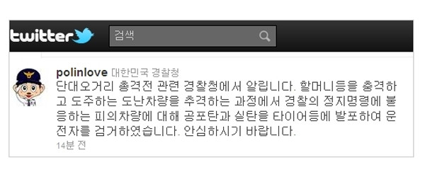 경찰은 트위터(@policelove)를 통해 '할머니 등을 충격하고 도주하는 차량을 추격하는 과정에서 경찰의 정지명령에 불응하는 피의차량에 대해 공포탄과 실탄을 타이어등에 발포하여 운전자를 검거하였습니다. 안심하시기 바랍니다'라는 메시지를 전파했다.