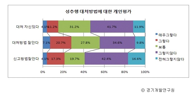 성추행 문제 해결방안으로는 '경찰에 신고하거나 인력배치 필요'(30%), '소리 지르기, 주변사람에게 도움요청'(27.8%)을 꼽았다.
