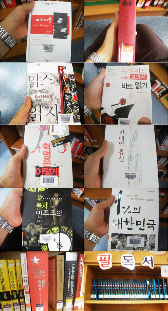 학교 도서관의 책들은 교사의 추천에 의해서도 구매가 가능하다는 것을 말씀드리고 넘어가겠습니다. 저희 학교에는 전교조 소속으로 확인된 교사가 69명이데 그 중 제가 아는 분들만 9명이 있습니다. 주로 사회 분야의 책을 구매할 수 있는 과목인 국어, 윤리, 사회, 역사 교사가 20명이라는 것을 보았을 때 결코 이는 적지 않은 수라는 것을 알 수 있습니다.