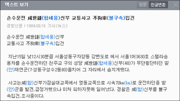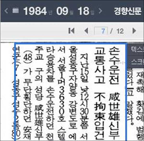결국 궁금증을 참지 못한 네티즌들이 ‘교통사고 낸 신부가 누구냐?’고 수소문하기 시작했는데, 의외로 금방 찾아냈다. 아래는 1984년 9월 18일 경향신문 7면에 난 기사다.