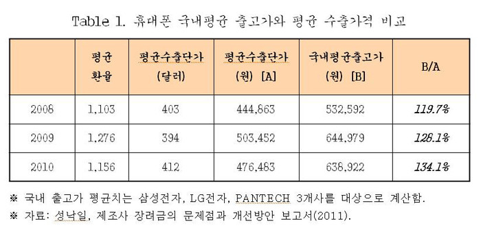 국회 문화체육관광방송통신위원회 소속 한나라당 이경재 의원이 입수한 성낙일 서울시립대 경제학과 교수의 ‘제조사 장려금의 문제점과 개선방안 보고서’에 따르면 지난해 국산 휴대전화(삼성전자·LG전자·팬택)의 평균 국내 출고가는 63만8천922원으로 조사됐다.