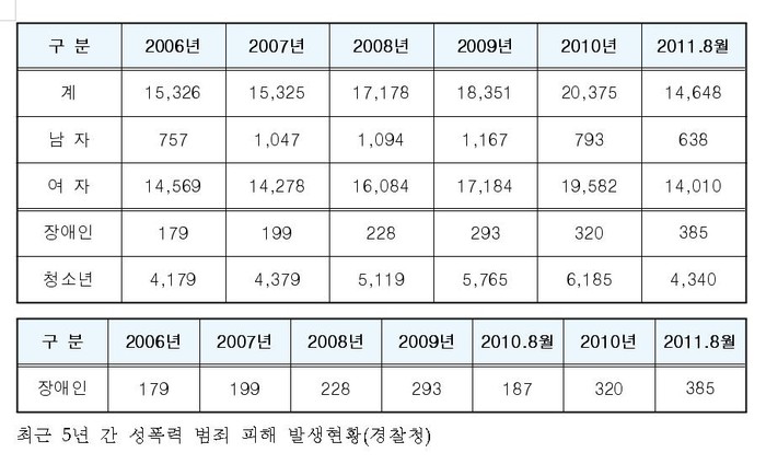 국회 여성가족위원회 소속 미래희망연대 김혜성 의원이 경찰청으로부터 제출받은 ‘최근 5년간 성폭력 범죄 피해 발생현황’ 자료에 따르면 올 들어 8월까지 발생한 장애인 관련 성폭력 범죄는 385건으로 지난해 동월의 187건에 비해 2배 이상 폭증했다.
