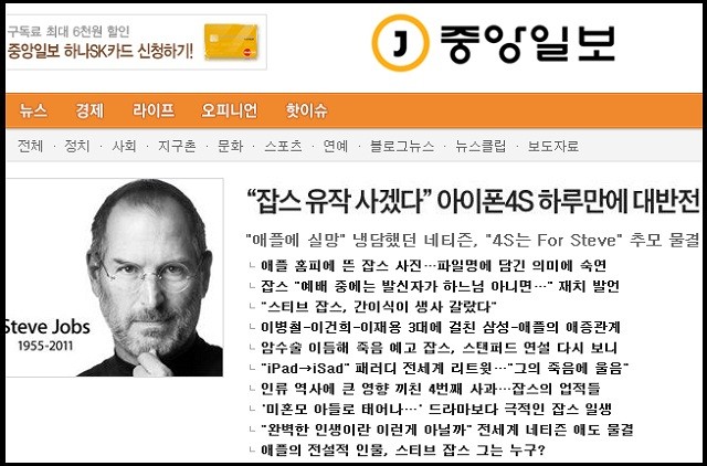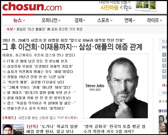온 세계가 IT/컴퓨터 영역의 영웅인 애플의 CEO 스티브 잡스를 추모하고 있다. 사망 후 경쟁사인 삼성전자 사장 이재용씨로부터 '잡스는 그야말로 천재예요, 천재'라는 찬사를 받고, 그의 조부인 이병철 전 삼성회장으로부터 1983년 '굉장히 훌륭한 기술을 가진 젊은이다. 앞으로 IBM과 대적할 만한 인물'이라고 찬사받은 스티브 잡스가 2011년 10월 6일 세상을 떠났다. -