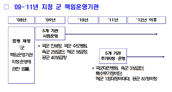 군은 2009년부터 국방개혁 과제의 하나로 ‘책임운영기관’을 지정하고 있다. 책임운영기관이란 군 내․외부에서 책임자를 공개 채용해 조직․인사․재정상의 자율권을 주고 일정기간 동안 조직을 운영하게 한 후 그 성과에 대하여 책임을 지도록 한 기관을 말한다.