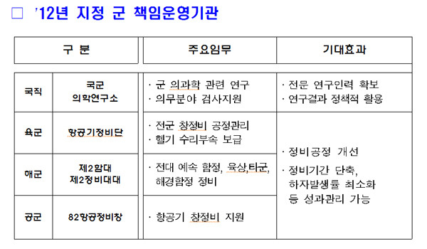 국방부는 이번에 지정한 육군 항공기 정비단 등 4개 기관은 금년 말까지 적격자를 공개 채용해 2012년 1월 1일부터 군 책임운영기관으로 운영할 계획이다.