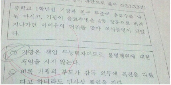 시험지의 문제는 “중학교 1학년 기광과 친구 두준이 음료수를 나눠 마시고 기광이 음료수병을 4층 창문으로 버려 지나가던 아이유의 머리를 맞아 의식불명이 되었다. 제시 된 사례와 관련 된 법적 판단은 무엇인가?” 라는 내용.