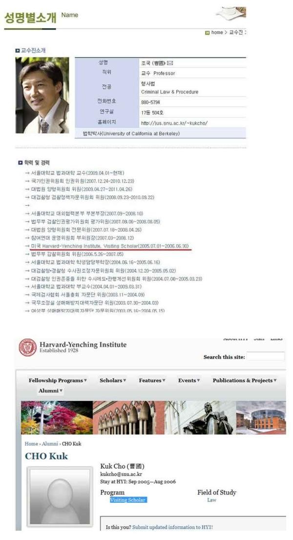 서울법대 홈페이지에 게재된 그의 경력에는 2005년 7월1일~2006년 6월30일 기간 동안 미국의 ‘하버드 옌칭 연구소’의 방문학자로 활동한 것으로 되어 있다. 이 내용은 조국 교수의 홈페이지(http://jus.snu.ac.kr/~kukcho/index.php)와 '하버드 옌칭 연구소' 홈페이지에도 그대로 게재되어 있다.